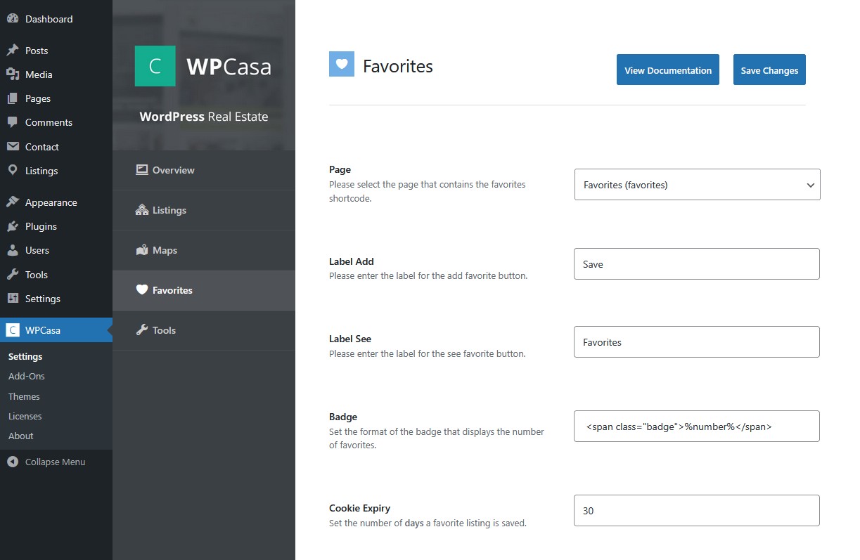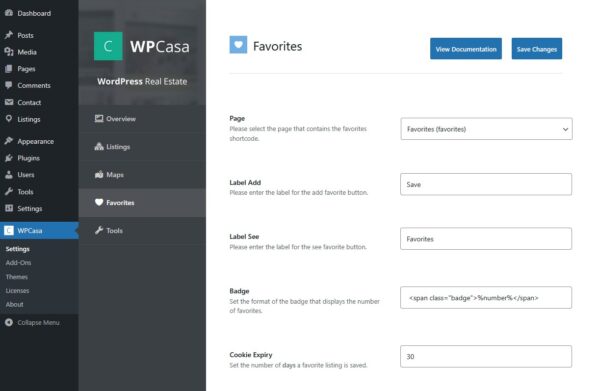 shortcode that is necessary to display the list of favorites. Under the new tab on the WPCasa settings page you can change the labels or the cookie duration and others.
